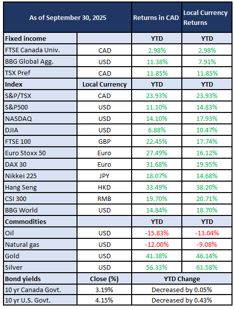 Global bonds have delivered strong returns so far in 2025 with the Bloomberg Global Aggregate Bond Index gaining 11.88% in Canadian dollars. Investment Grade bonds in Canada have been more muted, gaining 2.98% to the end of the quarter.